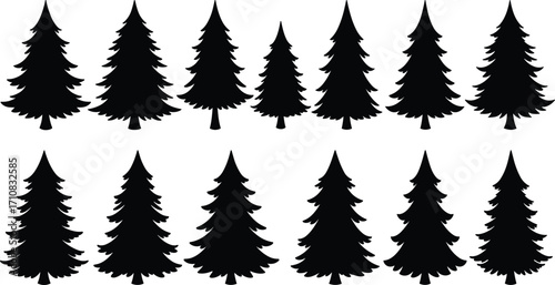 Set of black pine tree silhouettes, vector Christmas trees, isolated evergreen icons, nature design elements, graphic illustration collection