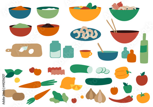 Set of bowls and food items. Cooking ingredients and ready meals. Bowls, plates of food, jars and bottles, vegetables, herbs, eggs, shrimps. Flat cartoon style. Isolated on white background. Vector.