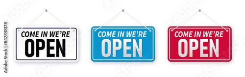 Set of business hanging signboard, we're open and closed. Closed and open. Red sign Sorry we are closed for holidays, with shadow isolated on red background. Vector