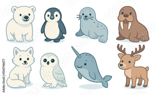 Set of cartoon arctic animals including polar bear, penguin, seal, walrus, arctic fox, snowy owl, narwhal, and reindeer. Cute stylized vector illustration of cold-climate wildlife