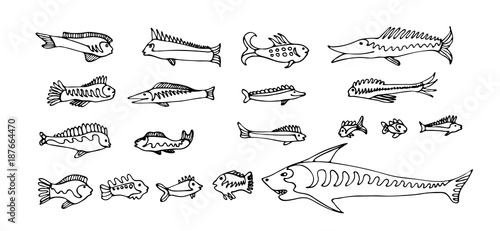 Set of cartoon fishes. Vector hand drawn outline clipart. Aquarium or sea collection. Black isolated on white background.