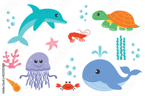 Set of cartoon sea animals. Tropical ocean animals, funny fish, turtles, dolphins, crabs and shrimp