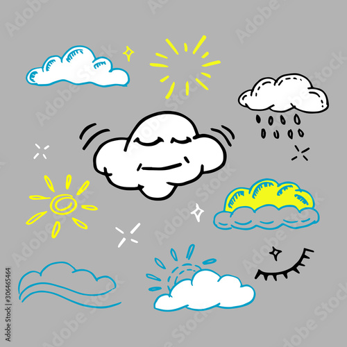 Set of cartoon weather icons with funny clouds, sun, rainny, sunshine and design element. vector doodle ilustration