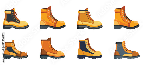 boot, shoe, work boot, hiking, footwear, construction, cartoon, vector, industrial, safety, leather, rugged, hard-wearing, tough, illustration, protective, waterproof, winter, trekking, gear, fashion, heavy duty, adventure, climbing, men at work, sturdy, grip, sole, casual attire, man, outfit, expedition, apparel, travel, equipment, yellow, brown, lace, ankle, strong, classic