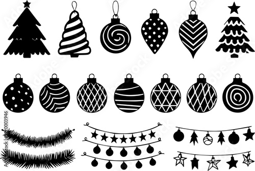 christmas, christmas, holiday, decoration, vector, tree, icon, illustration, celebration, ball, card, gift, ornament, set, winter, pattern, design, new year, new, snowflake, star, year, art, merry, bell