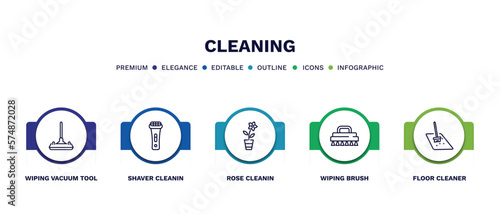 set of cleaning thin line icons. cleaning outline icons with infographic template. linear icons such as wiping vacuum tool, shaver cleanin, rose cleanin, wiping brush, floor cleaner vector.