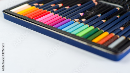 Set of color pencils with different size in pencil case on a white background