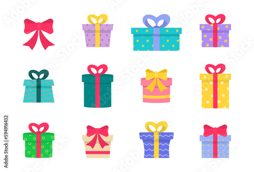 Set of colored gift boxes with ribbon. Colorful wrapped. Gift boxes different shapes and sizes. Collection for birthday, Christmas. Sale, shopping concept. Vector illustration