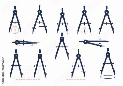 Set of compass illustrations for geometry, technical drawing, and design. Various angles and applications of the classic mathematical instrument.