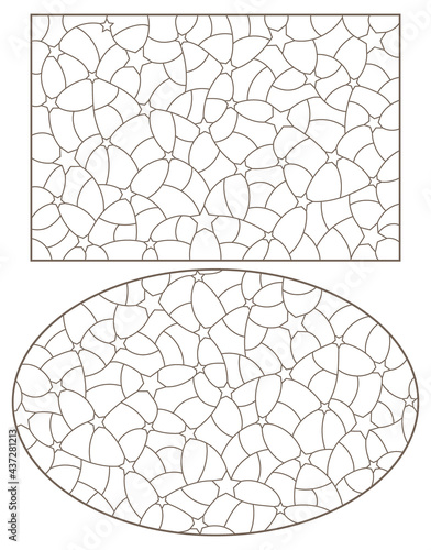 Set of contour illustrations of stained glass with abstract background images, dark contours on white background