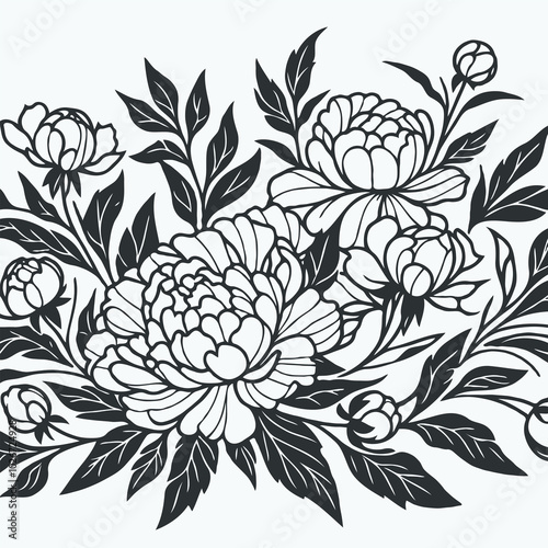 set of contour peony, poppy, anemone, ranunculus flower, line art of flowers, leaves black and white illustration set of decorative elements of plants