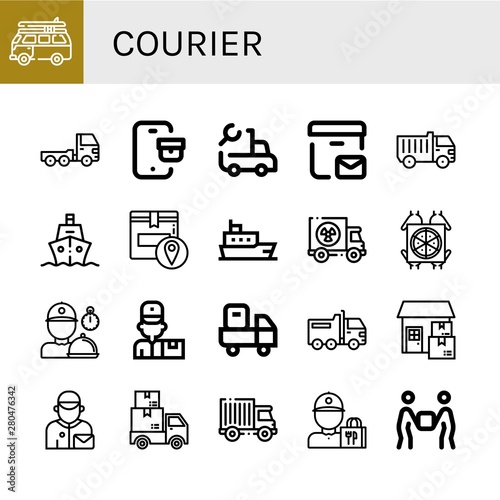 Set of courier icons such as Van, Truck, Tracking, Postal delivery, Ship, Pizza deliver, Delivery man, Delivery truck, Postman, guy , courier