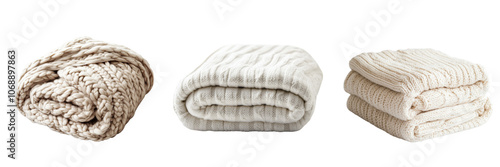 Set of cozy knit blanket folded, soft winter accessory isolated on a transparent background