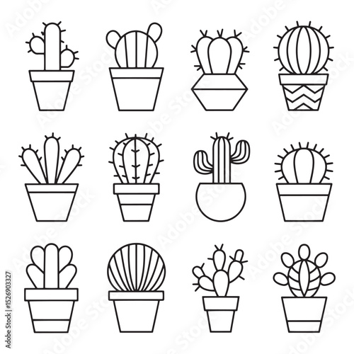 set of crowns. Set of Hand Drawn Cactus Icons in Pots – Cute Minimalist Succulent Line Art for Botanical, Nature, Garden, or Desert Decor Concepts