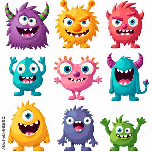 Set of cute cartoon monster characters. Funny happy alien or gremlin collection