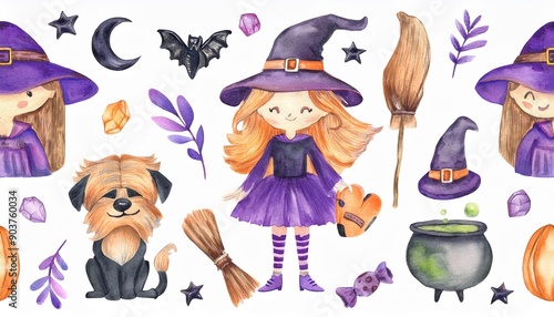 Set of cute watercolor Halloween's Day elements. Isolated on white background. Can be used for Halloween's day, greeting cards and invitations. Hand drawn watercolor illustration.