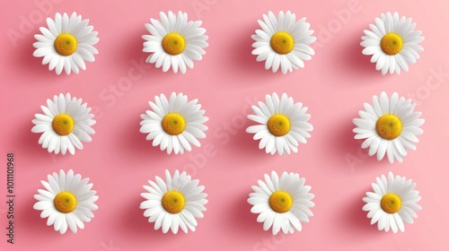 Set of daisy flower icons isolated on pink background, vector illustration featuring simple and elegant floral designs, perfect for spring-themed projects, graphic design elements, greeting cards, and
