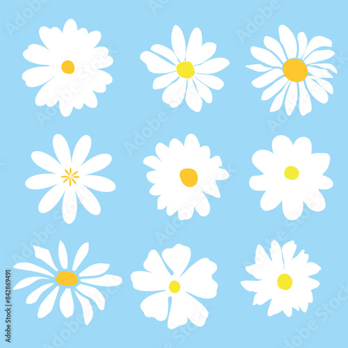 Set of daisy flowers on blue background, Hand-drawn daisies flowers pattern.botanical elements, Ink drawings of wildflowers,vector illustration natural background.eps 10.