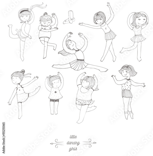 Set of dancing young girls, isolated on white, fun, kind, in dance studio. Kids in different dynamic poses, with raised hands and legs. Characters in different age, complexion. Black and white image