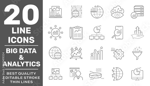 Set of Data Analysis and Big Data Related Vector Line Icons. Contains such Icons as Graphs, Traffic Analysis, Big Data, Data science technology and more. Editable Stroke. EPS 10
