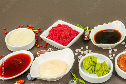 Set of different sauces - ketchup, mayonnaise, barbecue, soy, chutney, wasabi, adjika, horseradish