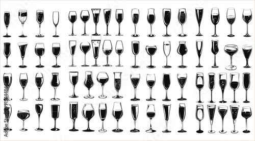 Set of drink glasses icons, Silhouette of drink and beverage glasses, Champagne glasses silhouettes