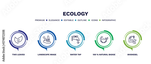 set of ecology thin line icons. ecology outline icons with infographic template. linear icons such as two leaves, landscape image, water tap, 100 % natural badge, biodiesel vector.