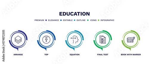 set of education thin line icons. education outline icons with infographic template. linear icons such as arrange, top, equation, final test, book with marker vector.