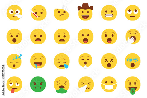 Set of emoticon smiley icons. Cartoon Emoji Set with smile, sad, happy, and flat emotion in flat style