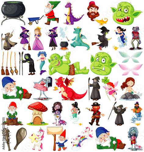 Set of fantasy cartoon characters and fantasy theme isolated on white background