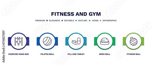 set of fitness and gym thin line icons. fitness and gym outline icons with infographic template. linear icons such as exercise hang bar, pilates ball, pill and tablet, bosu ball, fitness ball