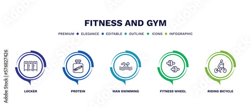 set of fitness and gym thin line icons. fitness and gym outline icons with infographic template. linear icons such as locker, protein, man swimming, fitness wheel, riding bicycle vector.