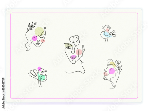 set of five illustrations of girls and birds in a linear style with colored spots
