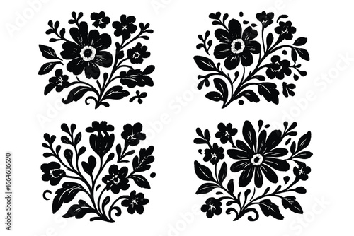 Set of four black floral decorative design elements. Botanical folk art flower silhouette collection. Hand drawn linocut style vector illustration for print, tattoo, or decor.