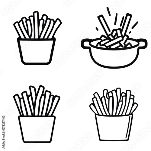 fast food, food, snack, symbol, french, simple, fries, icon, line, outline, meal, vector, pictogram, sandwich, burger, hamburger, french fries, ice cream cone, illustration, silhouette, background, pack, fries, label, abstract, black, business, package, chips, graphic