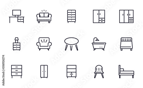 living room, chair, sofa, furniture, armchair, symbol, clothes rack, design, table, room, office, lamp, desk, home, pictogram, simple, cabinet, bed, interior, collection, icon, vector, outline, illustration, set, line