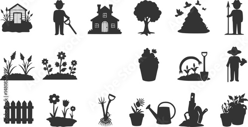 garden, tree, man, vector, illustration, design, background, graphic, symbol, isolated, icon, concept, white, plant, people, nature, agriculture, boy, gardening, park, growth, landscape, girl, care, farm, young, shovel, gardener, environment, children, work, male, green, silhouette, farming, person, family, character, education, woman, cartoon, childhood, grass, water, tool, set, pack, collection