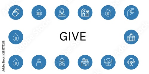 Set of give icons such as Applause, Blood type, Volunteer, Shelter, Give, Donation, Corruption, Medical support , give