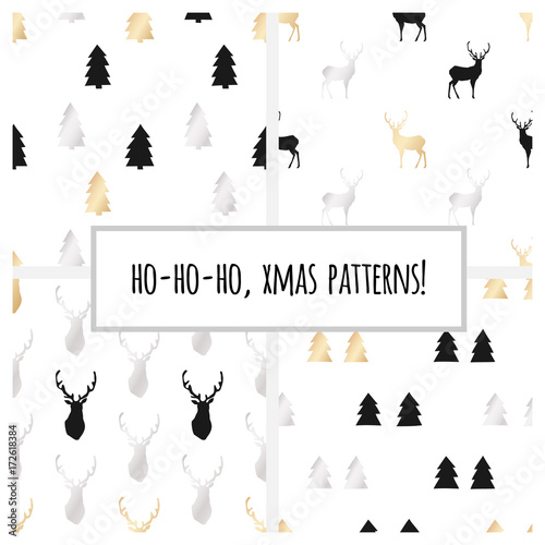 Set of gold foil seamless patterns with Christmas trees and deers for Christmas and New Year's wrapping paper. Vector illustration.