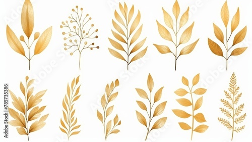 Set of golden leaves isolated on a white background. Assorted gold leaf illustrations. Concept of autumn elegance, botanical art, and nature-inspired design.