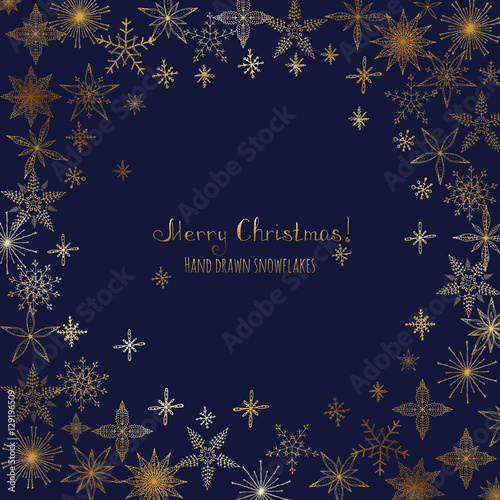 Set of hand drawn snowflakes. Ornament made from decorative golden snowflakes. Vector sketch illustration Christmas blue background with glitter snowflakes. Merry Christmas concept. Happy new year.