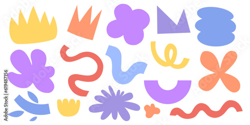 Set of hand drawn various colorful shapes and doodle objects in primitive child style. Abstract contemporary modern trendy vector illustration.