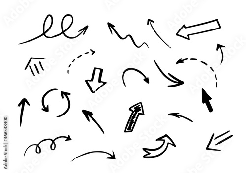 Set of hand-drawn different vector black arrows. Doodle curved and straight pointer collection isolated on white background