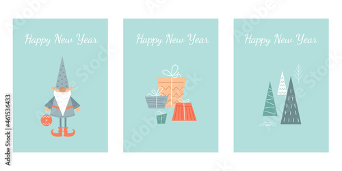 Set of Happy New Year and Merry Christmas cards in minimalistic Scandinavian style. Christmas gnome, gifts, tree. Vector stock illustration.