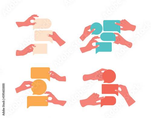 Set of Human Hands Holding Colorful Speech Bubbles With Various Sizes And Shapes, Ready For Conversations, Social Media