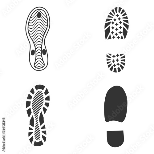 Set of humans footprint. Footprints silhouettes sneaker, shoes, flip-flops isolated on white background, such as idea of logo in gray. Stock vector. EPS10.