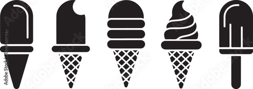 Set of ice cream silhouette icons. Popsicle, soft serve, cone desserts in black on white. Ideal for sweet snack designs and minimal summer visuals.