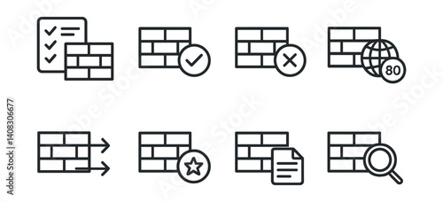 set, icon, checklist, brick, check, mark, cross, globe, arrow, star, document, magnifying, glasses, wall, cyberspace, security, firewall, magnifying glass, search, verification, protection, network, system, analysis, web, inspect, structure, symbol, datum, inspecting, exploration, assessment, brick wall