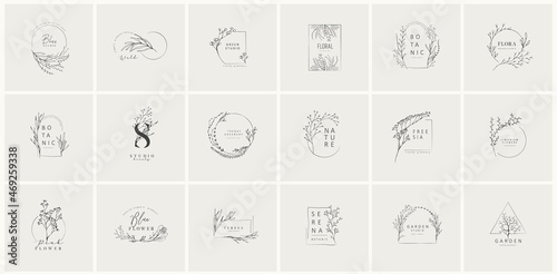 Set of inimal feminine botanical floral branch and logo. Hand drawn wedding herb, homeplant with elegant leaves. Botanical rustic trendy greenery vector