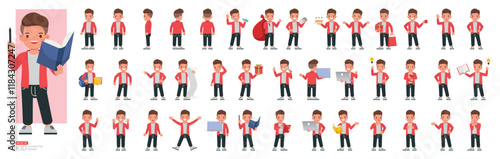 Set of kid character vector design. Boy wear red jacket. Presentation in various action with emotions, running, standing and walking.